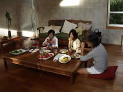 夜は、沖縄で野菜料理のケータリングを中心に活動しているVegan-Olakino(ヴィーガン・オラキノ)の金城静香さんの料理をいただきます。農家の畑から直接買った島野菜をを使った野菜だけの料理、」今回はデトックスプログラムにあわせて、酵素の多い生野菜、軽く火を入れた野菜と玄米を中心に、油を出来るだけ控えた油抜きの調理法で仕上げたメニュー。